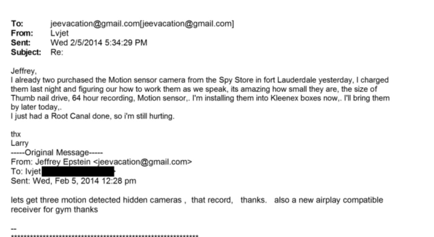 This is not at all surprising. Survivors recalled to me the feeling of being recorded. Inside Epstein’s upper east side mansion you can see cameras on the corners of the ceilings. His pilot Larry Visoski e-mailed him about installing pin cameras that were so small, that could fit in tissue boxes.